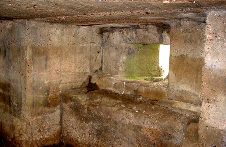 Kenmerken van een Einheitsunterstand-bunker![]() Deze mitrailleurpost naast de Oostendestraat in Leke bij Diksmuide is een mooi voorbeeld van een Einheitsunterstand, het standaardmodel voor Duitse bunkers vanaf 1917 (© Onroerend Erfgoed Vlaanderen). In de praktijk werd dat standaardmodel voor een bunker niet altijd rigoureus gevolgd. Er kon al wel eens van afgeweken worden, wat betreft het volume (grotere eenheden hadden nu eenmaal meer ruimte nodig), de beschikbare materialen en de ligging (bunkers die dicht bij de frontlinie lagen hadden vaak een andere indeling dan de bunkers verderweg). Hoewel varianten mogelijk waren zag een typische Einheitsunterstand er ongeveer uit als volgt: