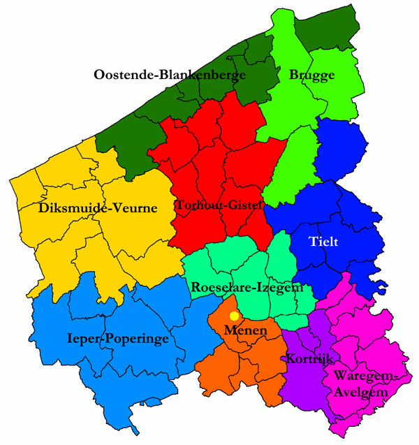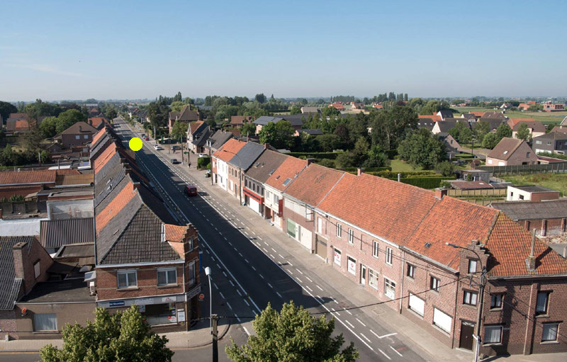 ![]() Panoramisch zicht vanuit de toren van de kerk van Beitem. Verder weg, 200 m. zuidwaarts (vanaf gele stip) strekt zich de Tuimelarewijk uit: deels links, maar grotendeels rechts van de Menensesteenweg (foto: F. Vandevelde).
