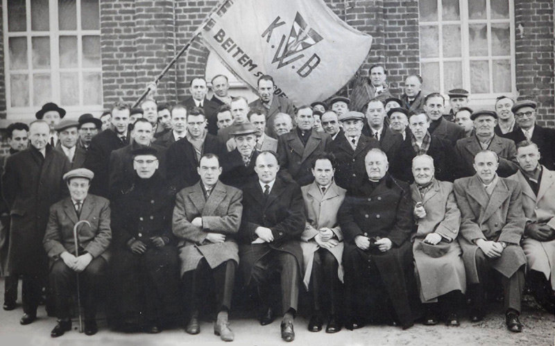 ![]() De Heilig Hartbond voor mannen in Beitem gedurende de jaren 1950-1960 (Foto: Joël Verbeke). Vele parochianen op de Tuimelare waren lid van een katholieke organisaties zoals de Heilig Hartbond, de Vrouwenbond, de Missienaaikring, de Eucharistische Kruistocht (EK) voor de schoolkinderen, e.a. Ook die verenigingen hebben het niet overleefd. Er zijn toch nog enkele stenen relicten van de parochie Beitem van weleer overgebleven: uiteraard het kerkgebouw, het kerkhof en een kapel.
