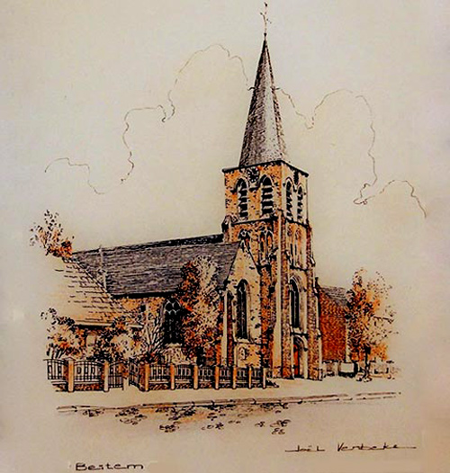 ![]() De parochiekerk van Beitem, vóór de afschaffing ervan begin 2016. (Joël Verbeke, ingekleurde pentekening, 1981).