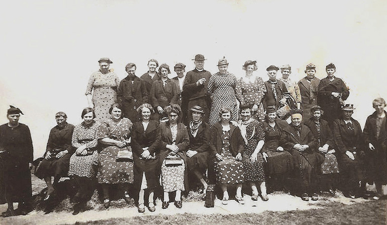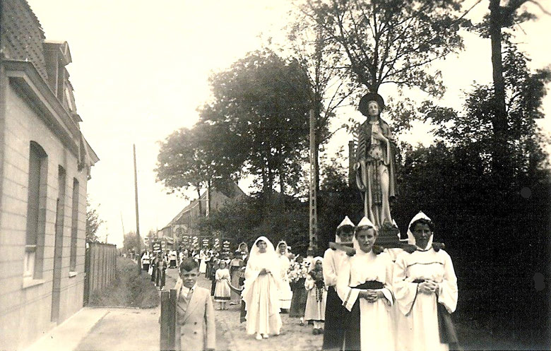 ![]() De jaarlijkse St.-Godelieveprocessie passeerde ook hier in de Monseigneur Catrystraat. Vanaf 1889 tot 2016, 127 jaar lang, was een groot deel van onze Tuimelarewijk opgenomen in de parochie Beitem. Automatisch namen de inwoners van Tuimelare voluit deel aan het parochiaal leven van Beitem, zoals het bijwonen van de mis op zon- en feestdagen; de deelname aan de sacramenten van het doopsel, de eerste en plechtige communie (vormsel), de kerkelijk huwelijksplechtigheden en begrafenissen; de jaarlijkse processies op de feestdag van de patroonheilige St.-Godelieve en op Sacramentsdag; de catechese voor 1ste en plechtige communies; de bedevaarten naar o.m. Dadizele, Lourdes, Br. Isidoor (Kortrijk), St. Godelieve (Gistel), Banneux en Beauraing. Sinds het opdoeken van de parochie Beitem is die binnenkerkelijke banden met Beitem weggevallen. ![]() De Vrouwenbond van Beitem anno 1938 op "speelvoyage" (daguitstap) - onder begeleiding van pastoor Camiel Lourdault - naar de Noord-Franse kustplaats Cap Gris-Nez (Foto: Magda Coeman).